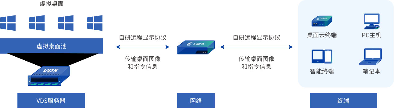 邁諾智能依托深信服桌面虛擬化方案通過虛擬化技術(shù),將原本在傳統(tǒng) PC 本地運(yùn)行存儲(chǔ)的桌面、應(yīng)用和數(shù)據(jù)全部遷移至數(shù)據(jù)中心統(tǒng)一承載管理,并在數(shù)據(jù)中心部署桌面云一體機(jī),以超融合技術(shù)將服務(wù)器的 CPU、內(nèi)存、存儲(chǔ)資源根據(jù)不同用戶的需求虛擬成一個(gè)個(gè)桌面虛擬機(jī),通過桌面交付協(xié)議將操作系統(tǒng)界面以圖像的方式傳送到用戶的接入設(shè)備,為用戶提供與 PC 使用方式相同的桌面環(huán)境。
